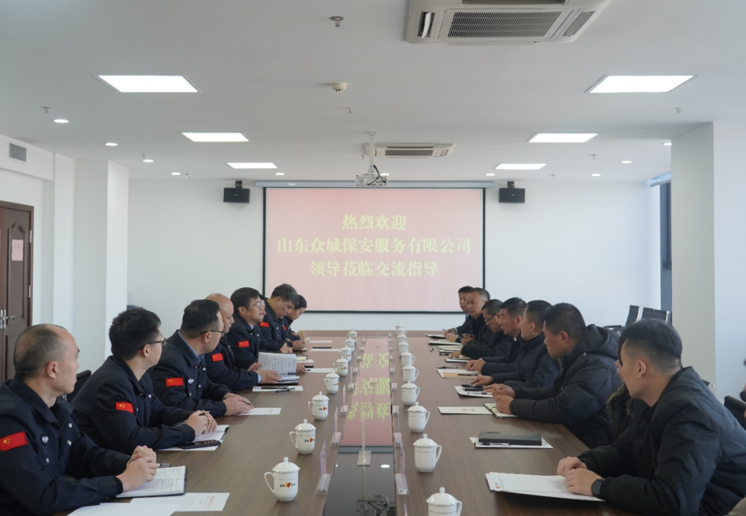 近日,山東眾城保安服務有限公司黨委書記、董事長杜軍一行10人來我公司考察交流,公司黨委書記、董事長付志欣及相關領導陪同。